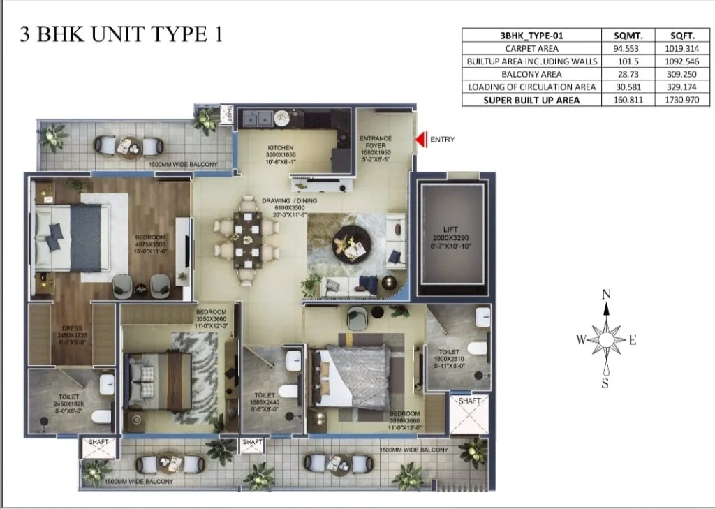 3 BHK – Type 1 1019.314 1092.546 309.250 1730.970